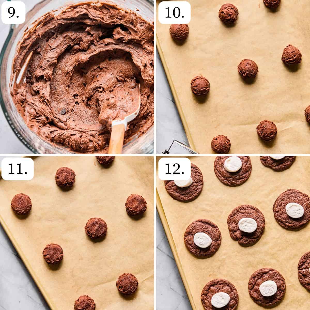 Step 12: Bake for 9 minutes. Remove from the oven and gently press half a marshmallow into the center of each cookie.